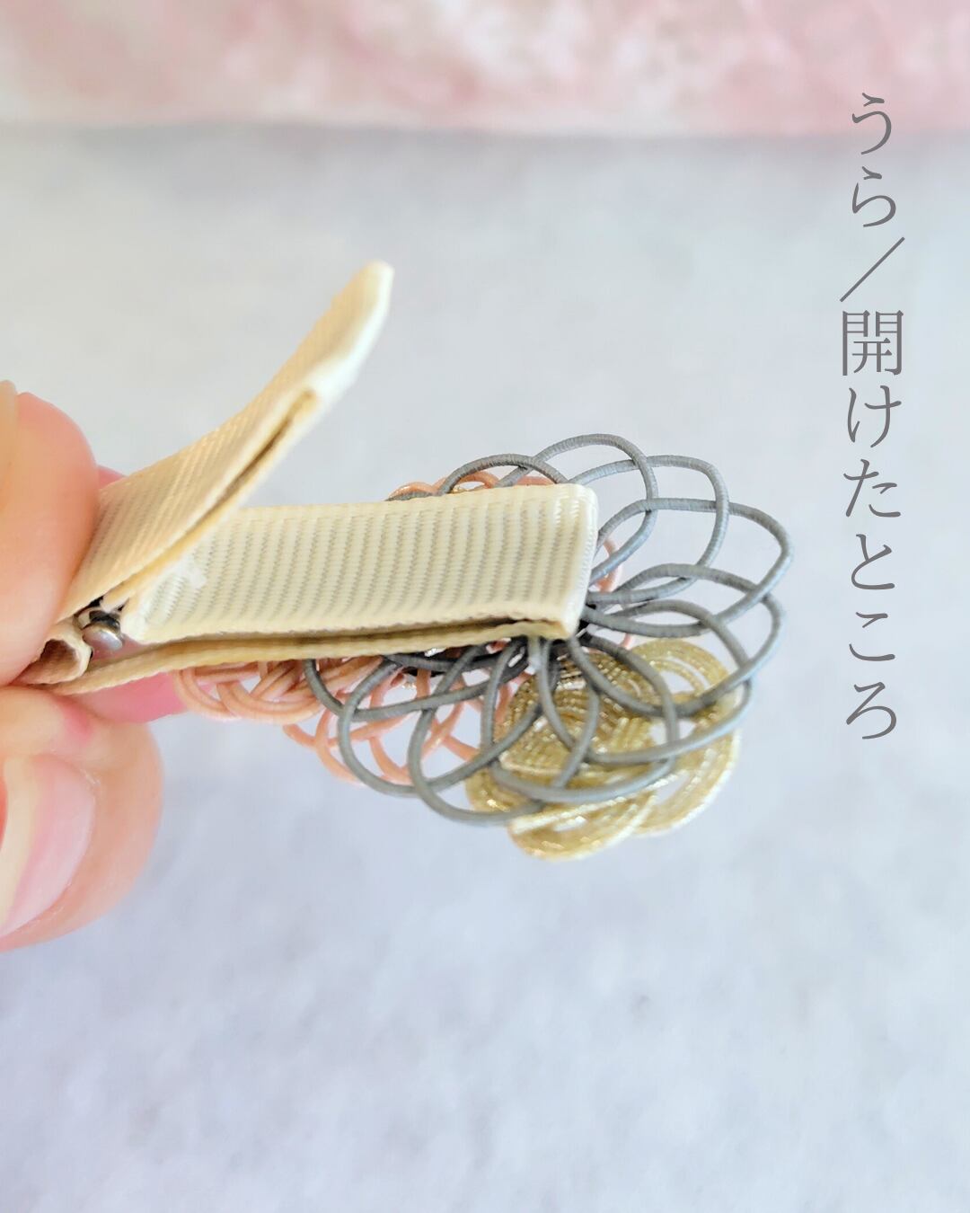 ベビーヘアクリップを結びました。モチーフ部分が中ぐらいのサイズになります。